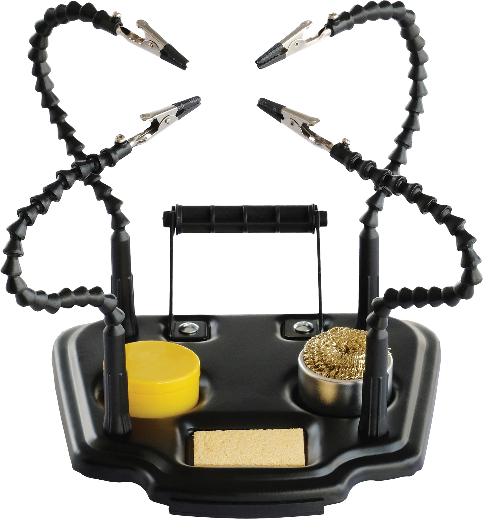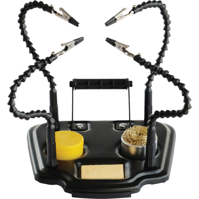 Flexible soldering helping hands with a sponge, rosin, solder wire stand, and cleaning ball set.