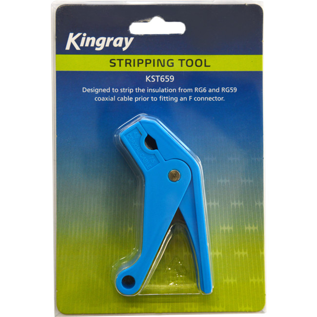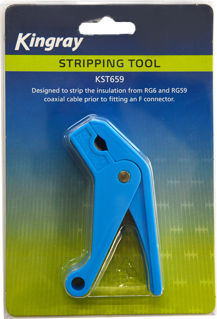The Kingray KST659 stripping tool is designed to be used with the KPL6P connector, the tool leaves the required 8mm of dielectric exposed for correct fitment of the KPL6P onto the coaxial cable. The KST69 tool is suitable for all variants of RG6 and RG59 cable and is supplied in retail friendly blister packaging