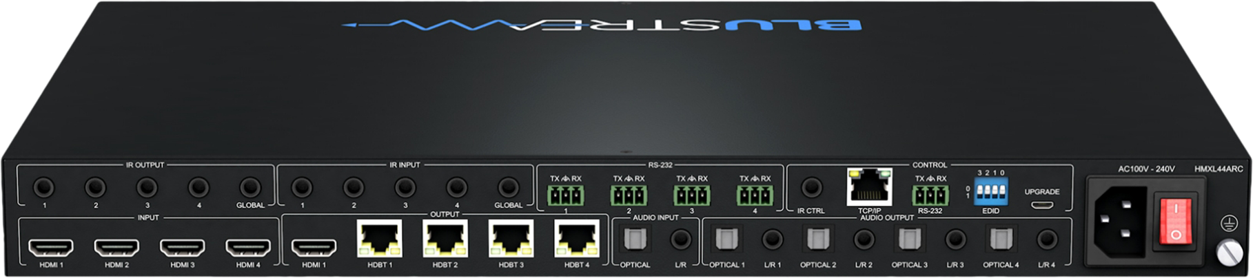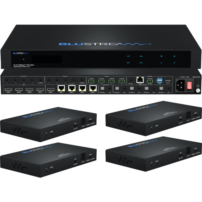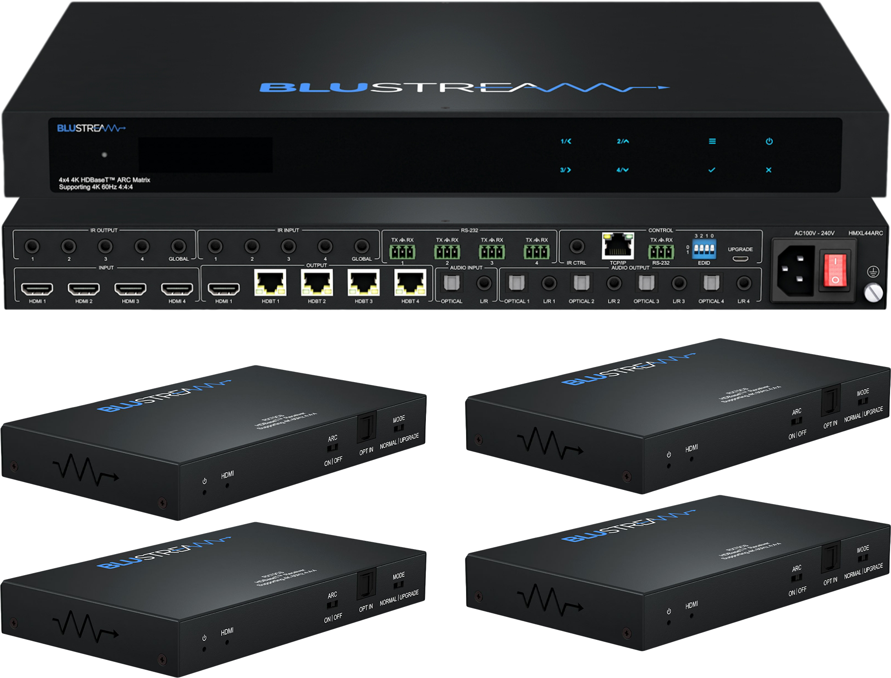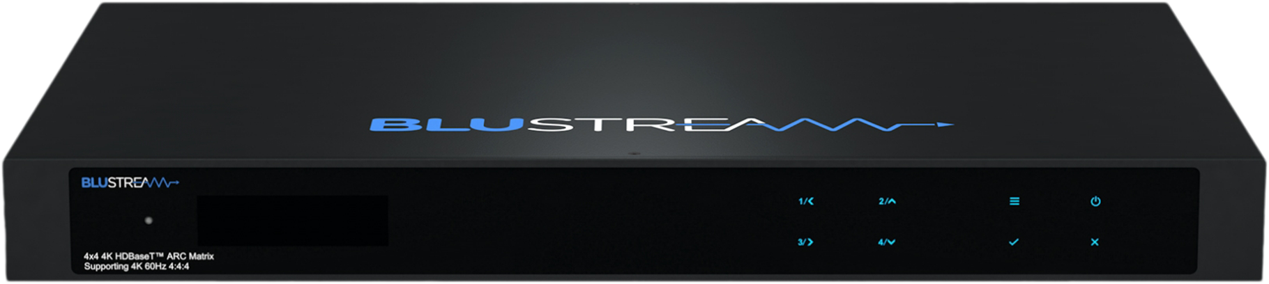 Our Essential 4x4 HDBaseT™ Matrix offers unprecedented performance and value for the custom installation market. The HMXL44ARC is a HDMI2.0 4K60Hz 4:4:4 HDCP2.2 Matrix package utilising CSC technology to deliver HDMI, Bi-directional IR and PoC up to lengths of 70m (at 1080p) over a single CAT cable. The Matrix also provides advanced features including simultaneous HDBaseT™/HDMI on output 1, video Smart Scaling on HDBaseT outputs and independent 14x4 audio matrix including Audio Return Channel (ARC). The HMXL44ARC includes in-built web browser interface module for control and configuration of the Matrix and RS-232 and IR pass through to enable seamless 3rd party control integration.