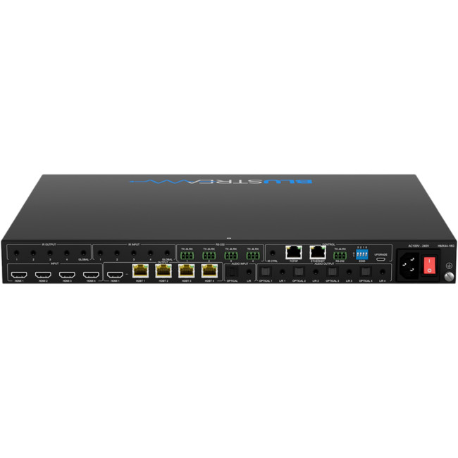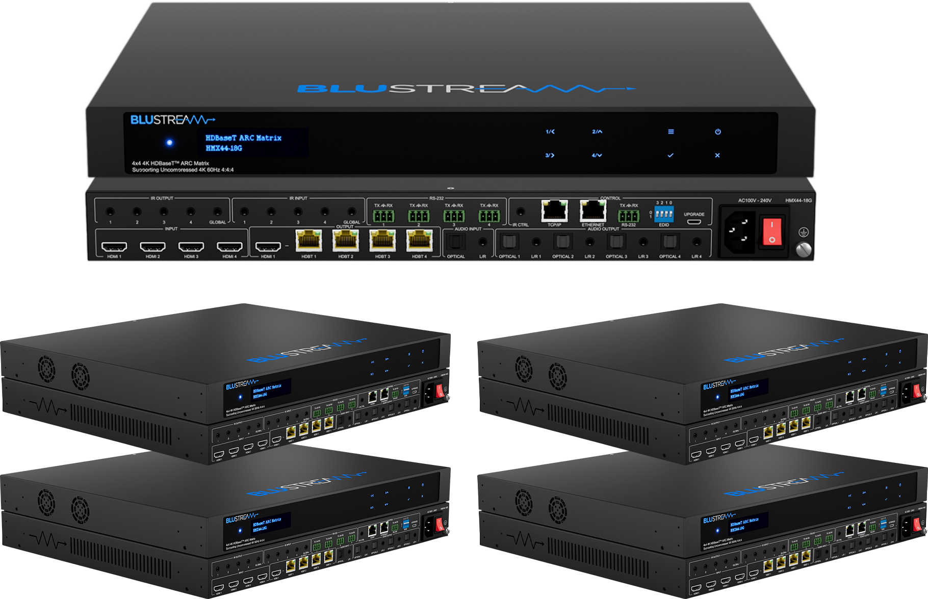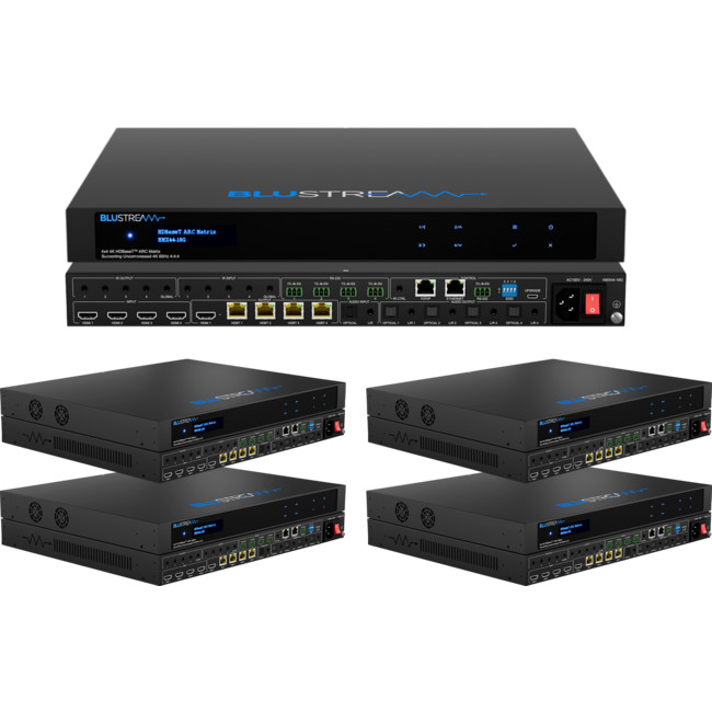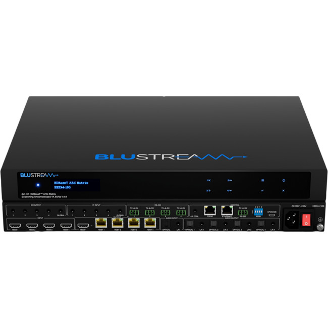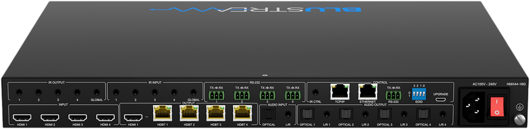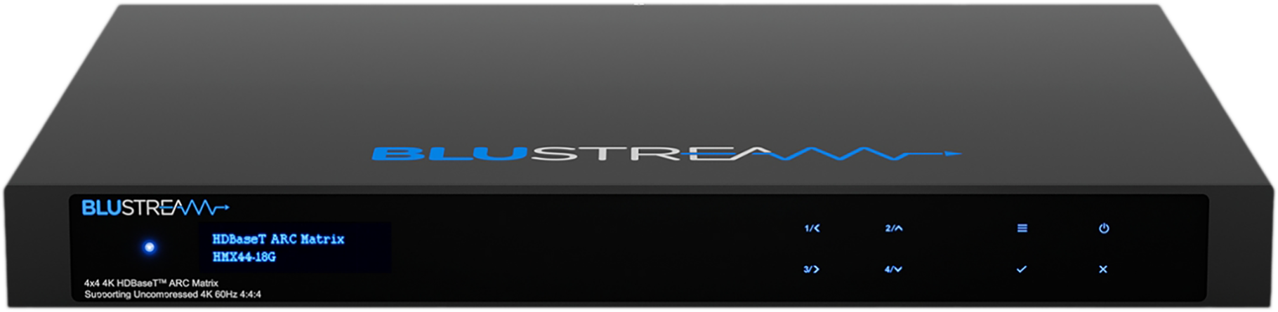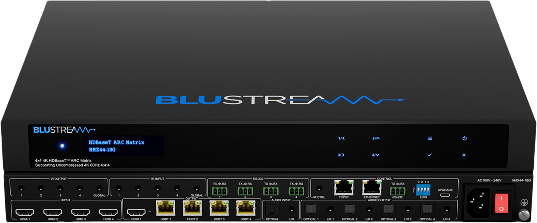 The HMX44-18G Matrix is an industry leading uncompressed, unconverted HDMI 2.0 4K 60Hz 4:4:4 HDCP 2.3/2.2 solution utilising HDBaseT™ 3 technology to deliver HDMI, Bidirectional IR & RS-232, ARC, 1Gb Ethernet, and PoC up to lengths of 100m over a single CAT6A cable. The HMX44-18G supports uncompressed distribution of the latest HDR resolutions including HDR10/10 and Dolby Vision resulting in the ultimate in picture quality for your critical viewing areas. The Matrix also provides advanced features including simultaneous HDBaseT™/HDMI on output 1, video smart scaling on HDBaseT outputs, and an independent 14x4 audio matrix, and ARC. The HMX44-18G includes an in-built web browser interface module for control and configuration of the Matrix, and RS-232, IR and 1Gb Ethernet pass through to enable seamless 3rd party control integration.