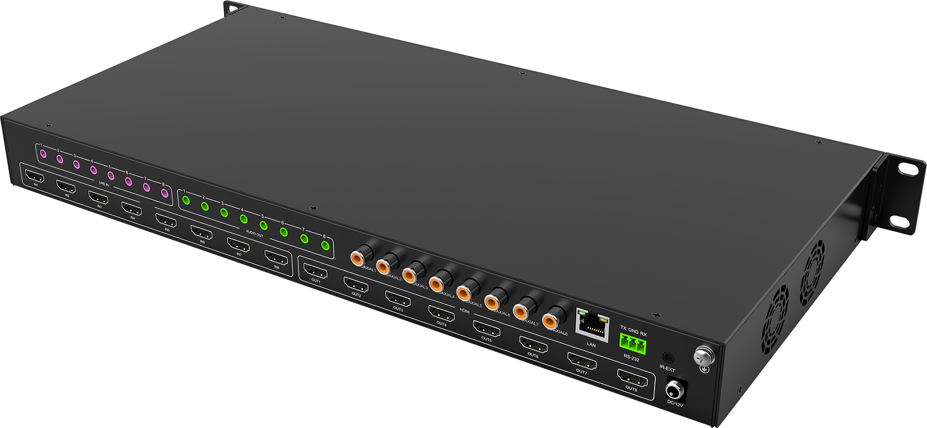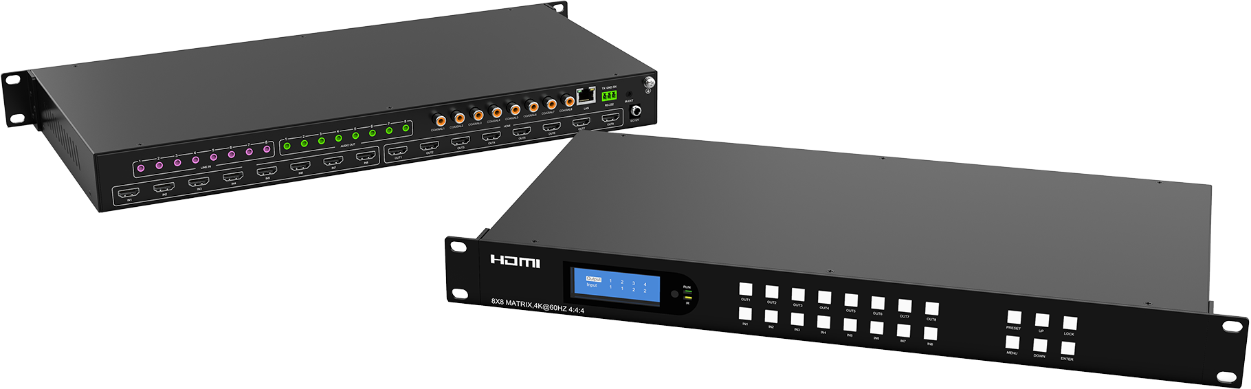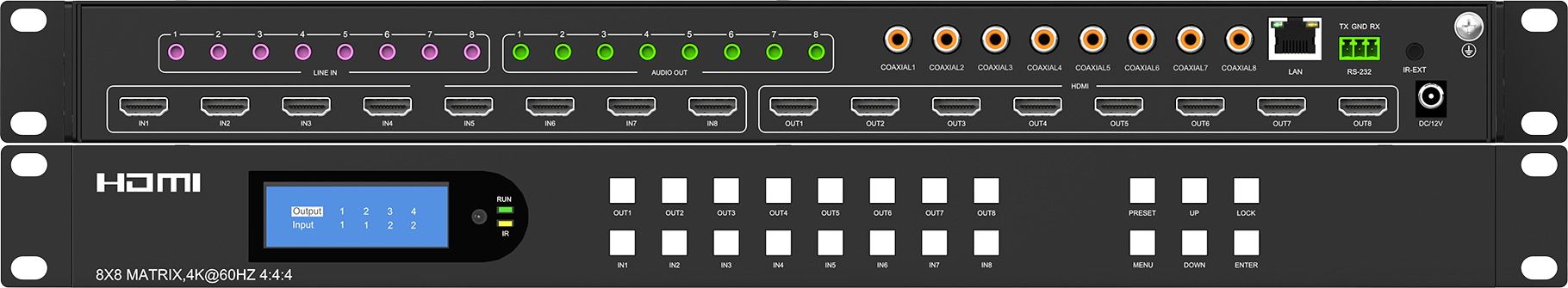 This 8x8 4K HDMI Matrix is designed to deliver seamless video transmission, supporting resolutions up to 4K2K@60Hz, HDCP 2.2, and HDMI 2.0. It allows you to route video and multi-channel digital audio from 8 HDMI sources to 8 HDMI outputs, along with 8 SPDIF outputs. The matrix is compatible with high-resolution digital audio formats, including Dolby TrueHD and DTS-HD Master Audio, and supports 3D video content. Additionally, it features the ability to embed and extract analog audio through 8 analog audio inputs and 8 analog audio outputs.