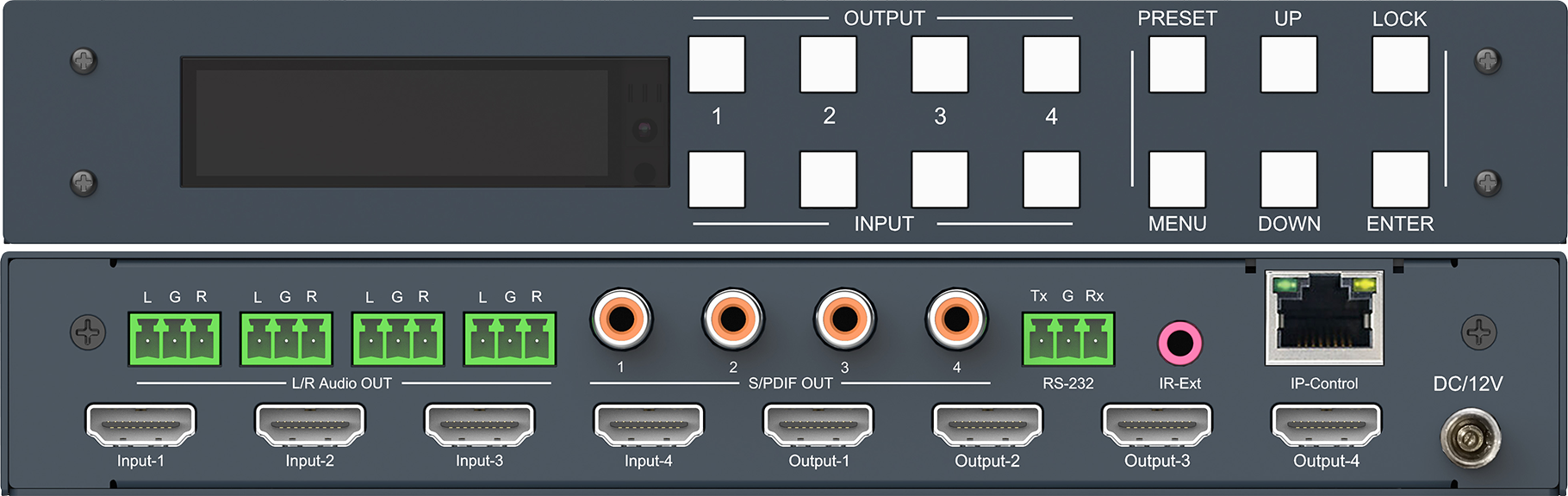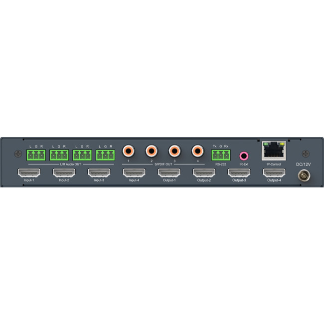 HDMIMX44V2 4x4 HDMI Matrix with 18Gbps Bandwidth and Audio ExtractionThis 4x4 HDMI matrix with 18Gbps bandwidth and audio extraction is a cutting-edge device designed to manage and distribute high-quality audio and video signals across multiple sources and displays independently. Supporting 4K resolution at 60Hz, this advanced HDMI matrix ensures stunning visual clarity and smooth performance, making it perfect for home theaters, gaming setups, conference rooms, and professional AV environments.